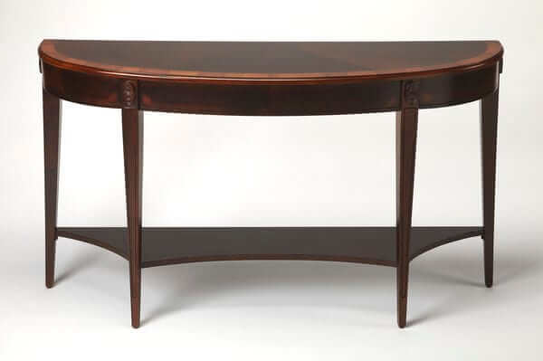 Transform your home into a gallery of timeless design with the Butler Specialty Astor Dark Brown Nouveau Console Table. Every detail of this exquisite demilune piece speaks of artistry and sophistication — from its hand-rubbed nutmeg finish to its intricately carved urn medallions and gently tapered legs.
