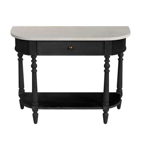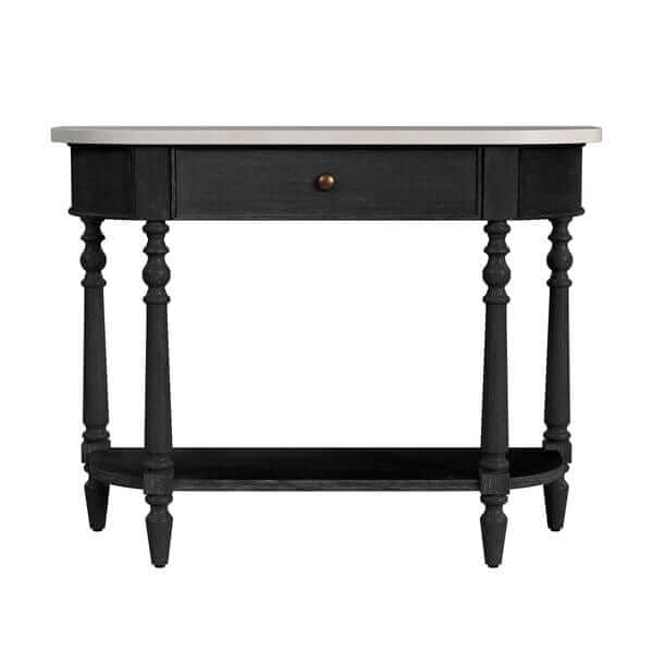 Bring timeless sophistication to your home with the Butler Specialty Company Danielle Marble Console Table. A stunning blend of farmhouse charm and modern refinement, this piece features a genuine Melati marble top paired with solid poplar wood and cherry veneers for a rich, enduring finish. The hand-turned legs and antique hardware add a touch of rustic elegance, while the demilune shape and spacious drawer provide both function and beauty. Available in Rustic Gray, Sandalwood Beige, and Weathered Black, the Danielle Marble Console Table makes an exquisite statement in your entryway, hallway, or living space.