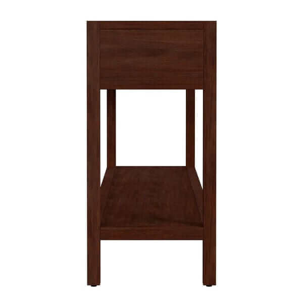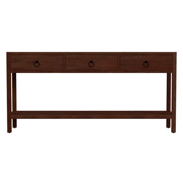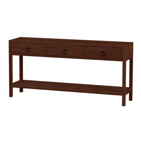 Expertly constructed from solid Acacia wood, engineered wood, and Acacia veneers, the Butler Lark Console Table showcases a warm Walnut Brown finish enhanced by elegant brass drawer pulls. Three spacious drawers glide smoothly on ball-bearing metal slides, while a wide open shelf offers stylish display space or practical storage. Kiln-dried wood construction ensures long-lasting durability, and plastic floor protectors preserve your floors from wear.