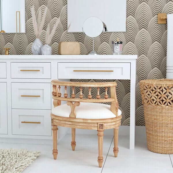 • Suitable for vanity nooks, powder rooms, bedrooms, or upscale retail spaces, this petite yet elegant vanity seat adds classic charm and comfort with its upholstered design and carved wood details.